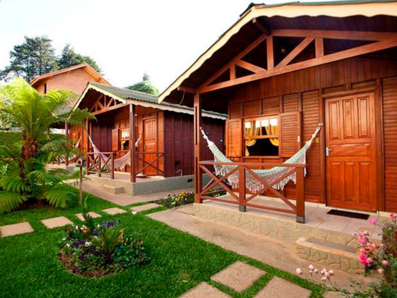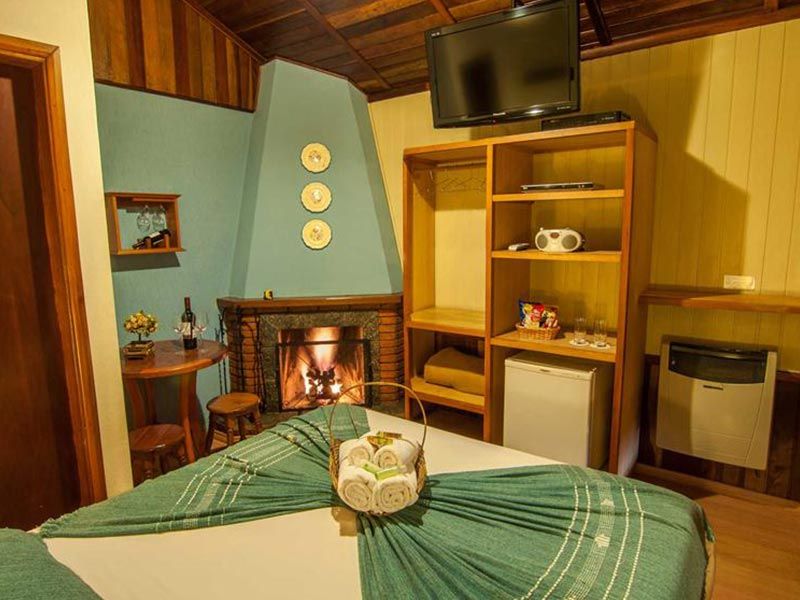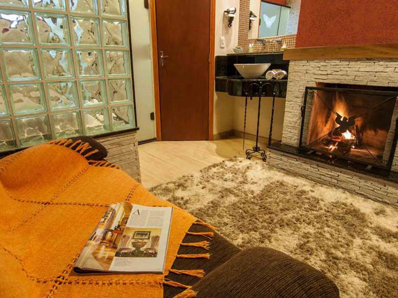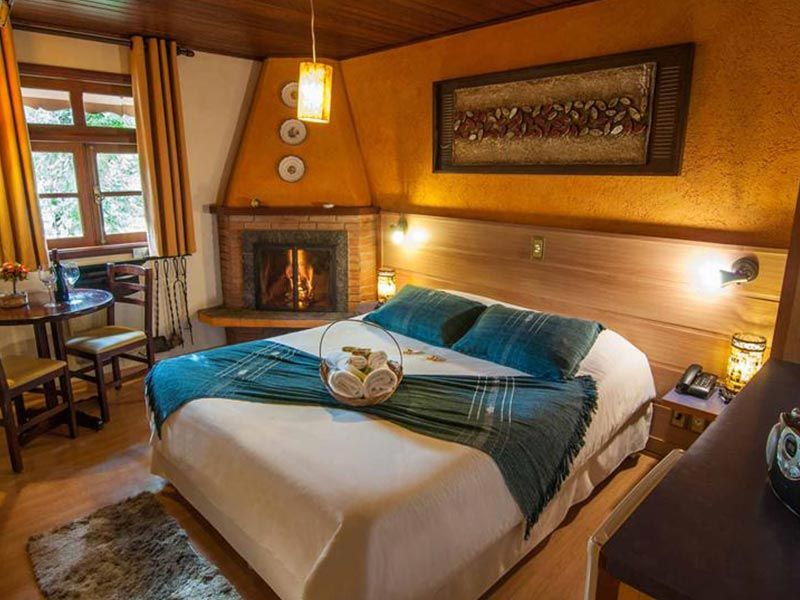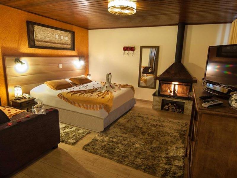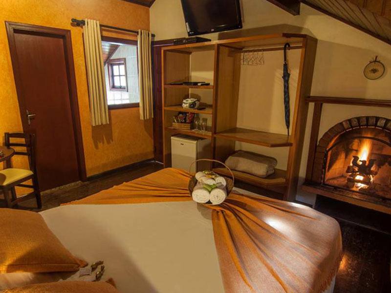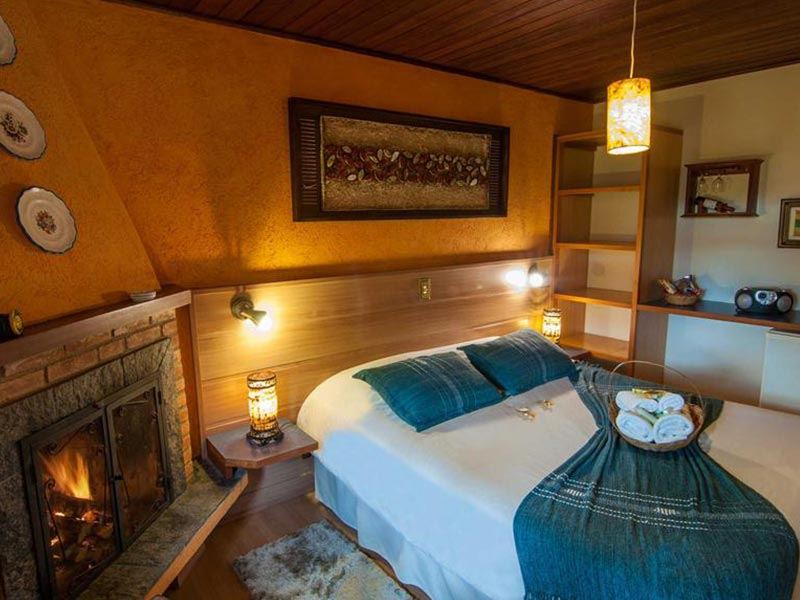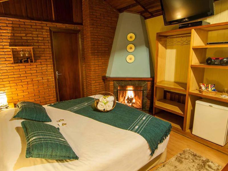 É nossa opção mais econômica, mas com toda qualidade e conforto que você merece. Alguns acomodam até 3 pessoas. Uma romântica lareira ao pé da cama e decoração especial completam o clima para você curtir o friozinho do inverno de Monte Verde. Uma agradável varanda com rede na frente dos chalés é um convite ao descanso.