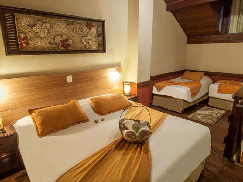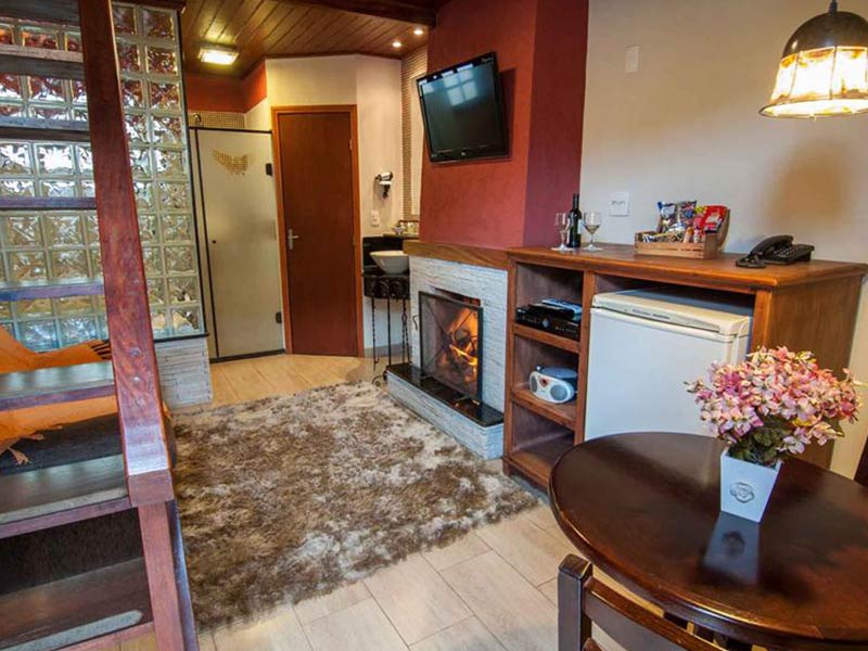 Opção para quem quer vir com a família, mas não abre mão de um relaxante banho de hidromassagem. Decoração moderna e diferenciada para famílias. Mesclando alvenaria e madeira possui na parte inferior sala de TV e lareira e o banheiro. A banheira de hidromassagem é espaçosa e integrada à sala. No mezanino, por escada interna, o dormitório tem 1 cama de casal e 2 de solteiro.