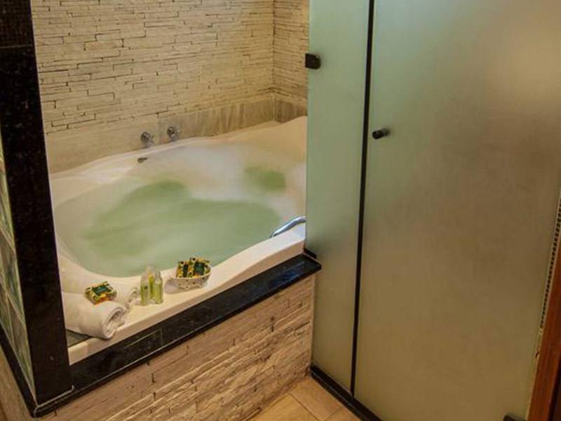 Sua diferença em relação ao Apto Luxo com Hidro s/ Deck é a ligação direta da banheira com o quarto através de um deck estrategicamente posicionado ao lado da banheira proporcionando uma charmosa integração entre os ambientes. Aconchego e romantismo se unem para atender ao hóspede que escolhe esta acomodação.